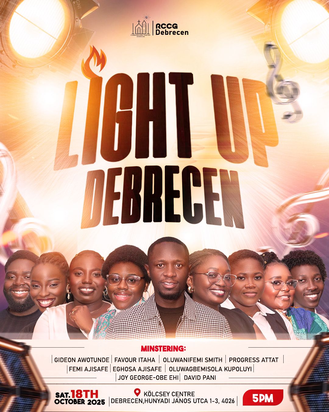 Debrecen, Hungary – The city is set to experience an electrifying evening of worship, inspiration, and spiritual awakening at the “Light Up Debrecen” event hosted by RCCG Debrecen. Scheduled for Saturday, October 18th, 2025, the event will begin at 5 PM and take place at the prestigious Kölcsey Centre, located at Hunyadi János utca 1-3, 4026 Debrecen.