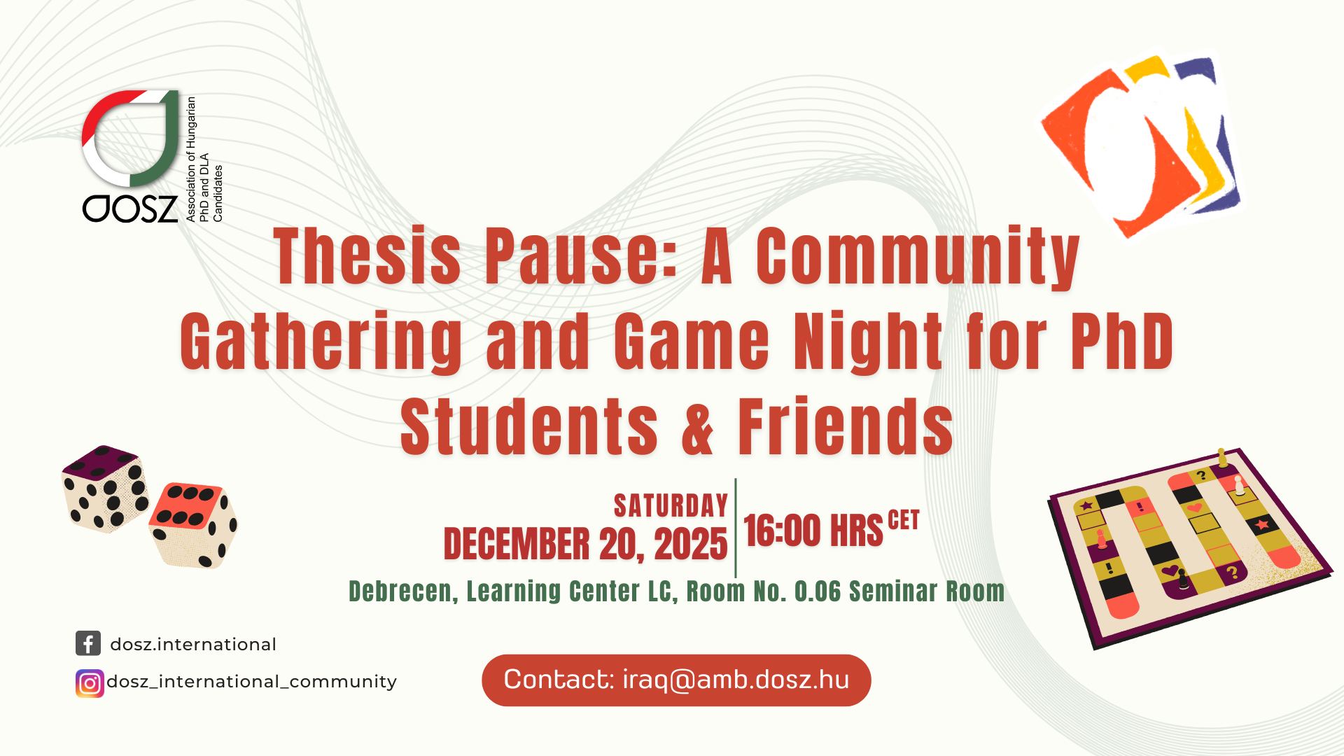 DOSZ invites all PhD students and the wider university community to a relaxed Community Gathering and Game Night on Saturday, December 20, 2025, from 16:00 to 20:00 at the University of Debrecen, Learning Center LC, Room 0.06 Seminar Room. The event offers a low-pressure environment to de-stress, meet new people from various disciplines, and enjoy a variety of board games—from quick party games to strategic challenges. No prior experience is needed, just bring your enthusiasm and get ready to roll the dice!